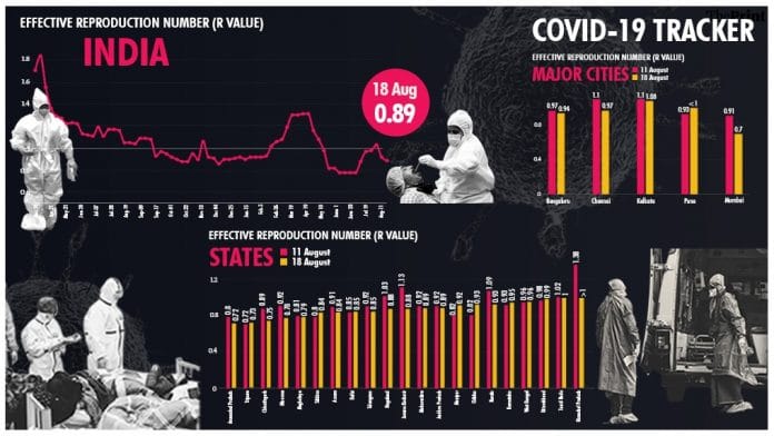 After a brief rise to over 1 two weeks back, the R value in India fell to 0.92 last week. Sitabhra Sinha, a researcher at the Institute of Mathematical Sciences who has been tracking R since the beginning of the pandemic, told ThePrint that this week, the R for India has reduced further to 0.89.