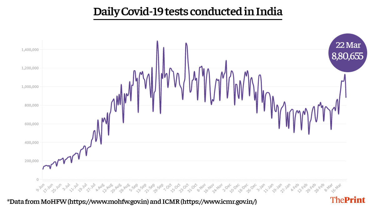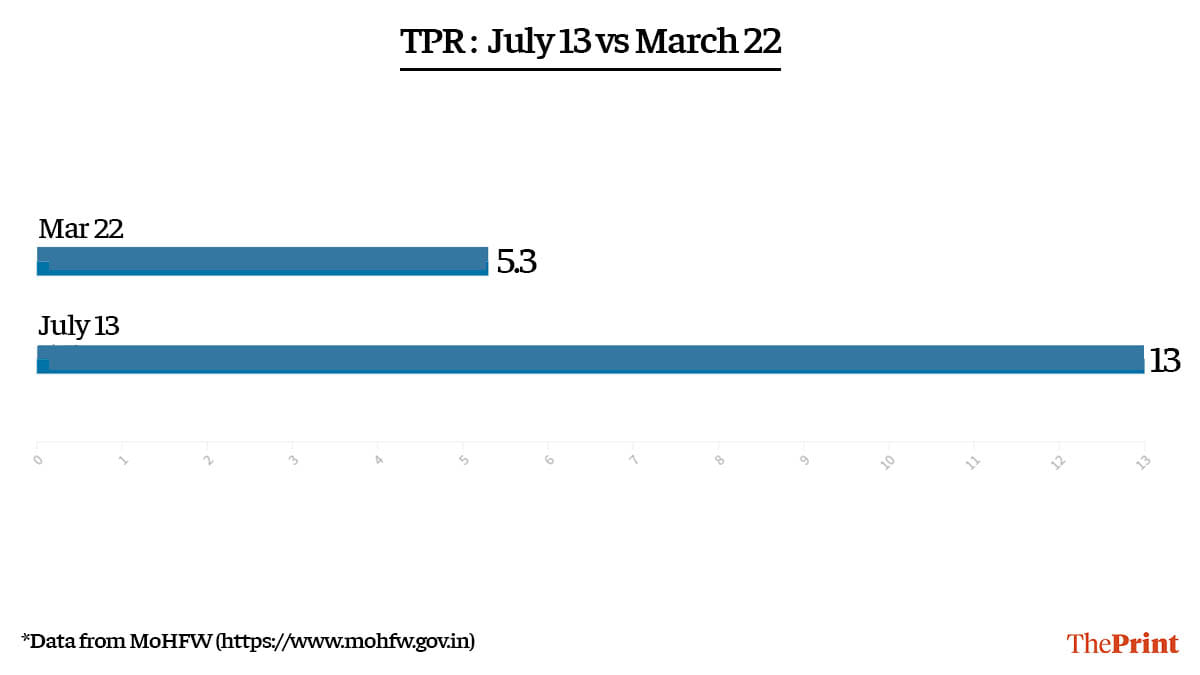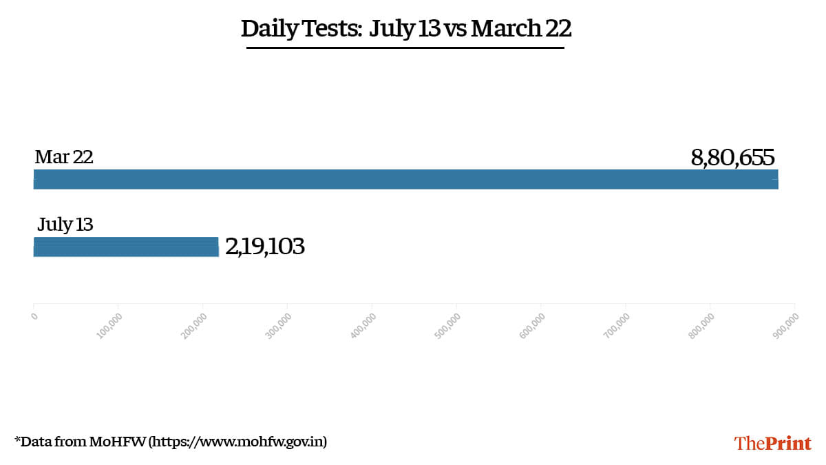 While cases were on a decline in December, ThePrint looked at data from 13 July when active cases were over three lakh and rising. At the time, daily tests conducted were just over two lakh, as opposed to over eight lakh now.