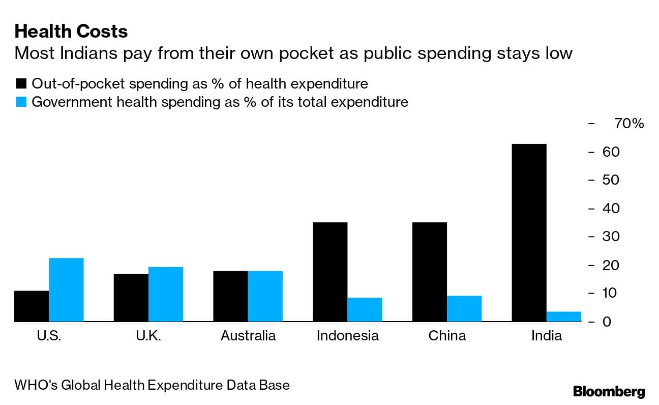 Nigam is among roughly two-thirds of Indians that don’t have any health insurance, compounding the problems facing India’s economy as it tries to recover from the shock of a rare contraction last year. Overcrowded government hospitals with long lines and poor facilities prompt people to spend out of pocket for better treatment in the private sector.
