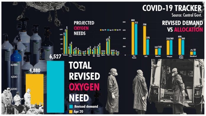 According to the initial projections by Delhi, the national capital will require 445 MT of Oxygen on 30 April. In a letter to state health secretaries dated 26 April, the Centre said has increased Delhi’s allocation to 490 MT.