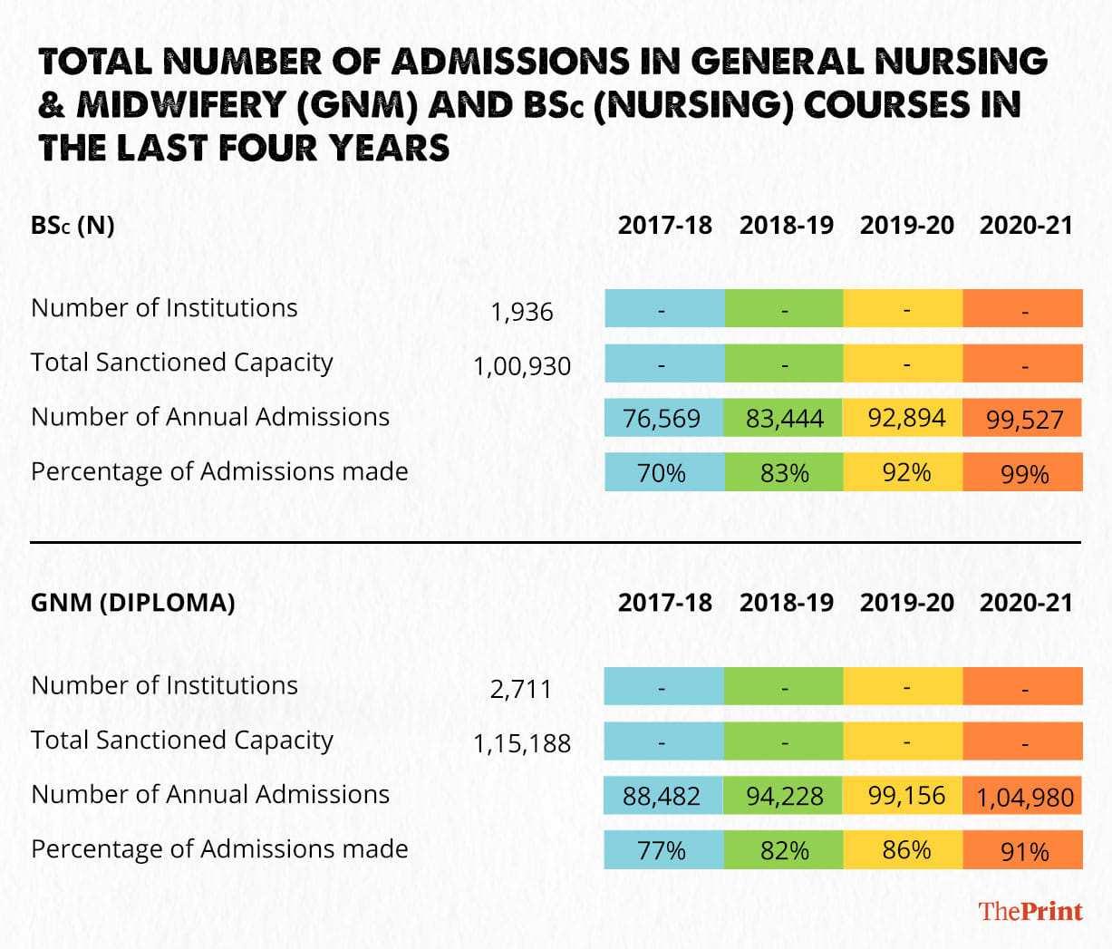The occupancy of the 1,15,188 GNM diploma seats in 2,711 institutions touched 82 per cent in 2018-19 and 86 per cent in 2019-20.