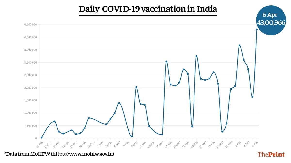 In the last 24 hours, vaccinations across the country were scaled up to 43,00,966. This is the highest number of vaccines shots administered in a day since the drive started in India on 16 January.