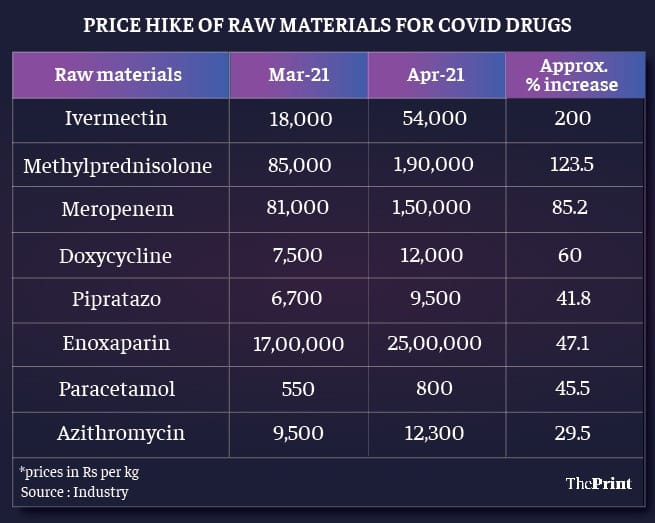 According to data accessed by ThePrint from the pharmaceuticals industry, the prices of many active pharmaceutical ingredients (APIs), such as ivermectin, methylprednisolone, doxycycline, enoxaparin, paracetamol, azithromycin, meropenem and pipratazo, needed for the production of key Covid medicines, have gone up by approximately 30-200 per cent in the past one month, between March to April 2021.