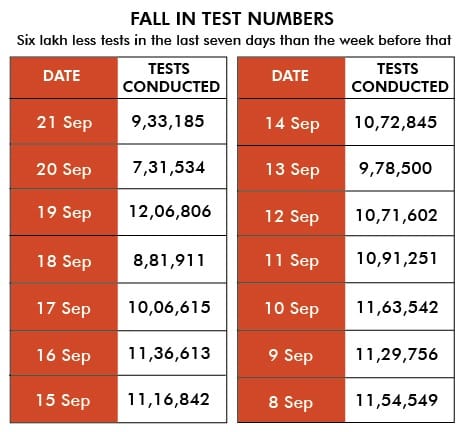 While India is conducting lakhs of tests everyday, the number for the last seven days — 70,13,506 samples — is 6 lakh lower than that for the week before.