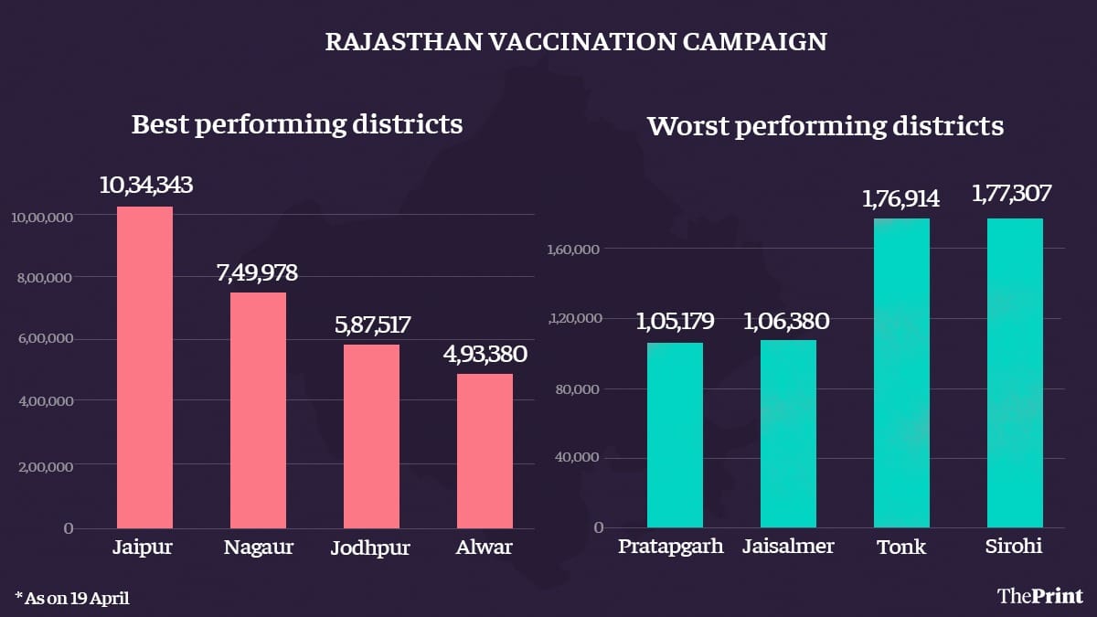 According to government data, as of 20 April, Rajasthan had administered a total of 1,15,55,568 doses, with 98,68,252 people having received the first shot and 16,87,316 people both shots. Jaipur is the district with the maximum number of vaccinated people, followed by Nagaur, Alwar and Jodhpur. Districts that are lagging behind include Pratapgarh, Jaisalmer, Tonk and Sirohi where less than 2 lakh people each have been vaccinated.