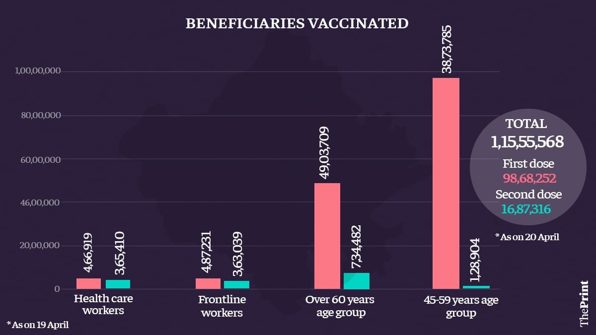 According to a report on daily vaccinations, accessed by ThePrint, the number of doses administered on 11, 12 and 13 April was 1.1 lakh, 2 lakh and 1.48 lakh, respectively.