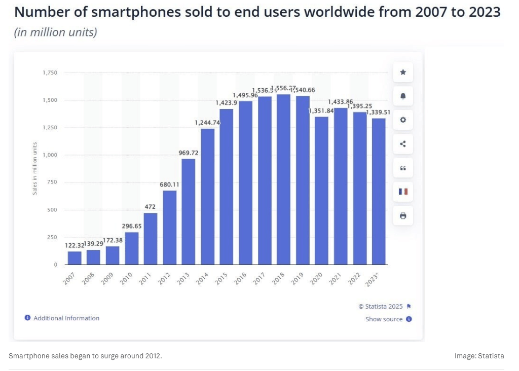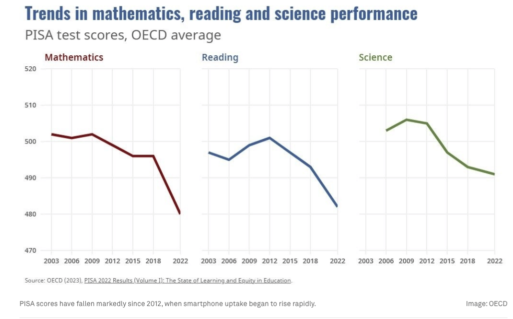 Academic performance has plunged since 2012 – five years after the release of the first smartphone and around the time when sales really started to accelerate. Programme for International Student Assessment (PISA) scores show drops in performance in all the core subjects.