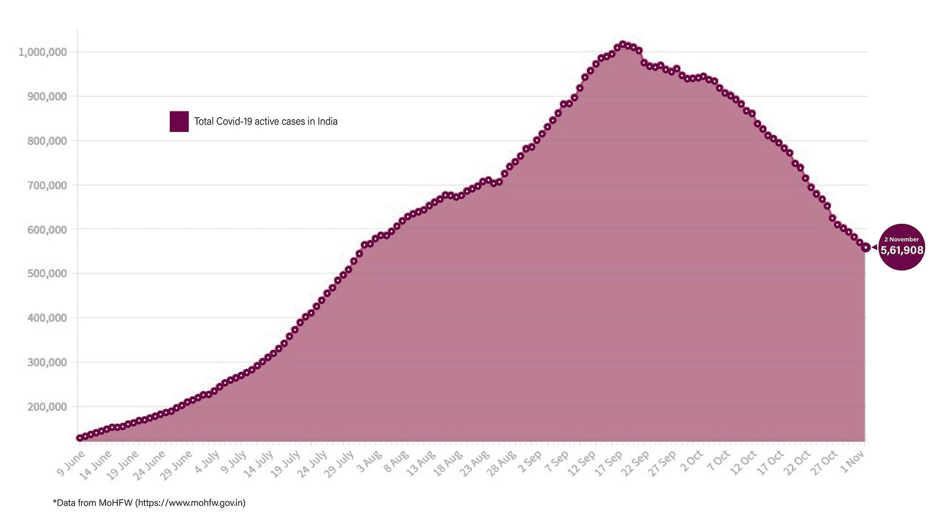 The number of active cases continues to fall in the country, dipping to 5,61,908 Monday. This accounts for 6.83 per cent of the total cases detected in the country, so far.