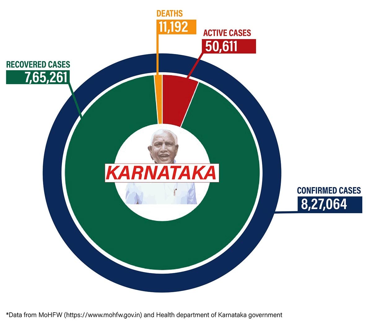 In Karnataka, 50,611 Covid cases are currently active. The state has recorded 11,192 deaths since the beginning of the pandemic. The total number of cases in the state, so far, is 8,27,064. In the last 24 hours, the state reported 3,652 new cases and 24 deaths.