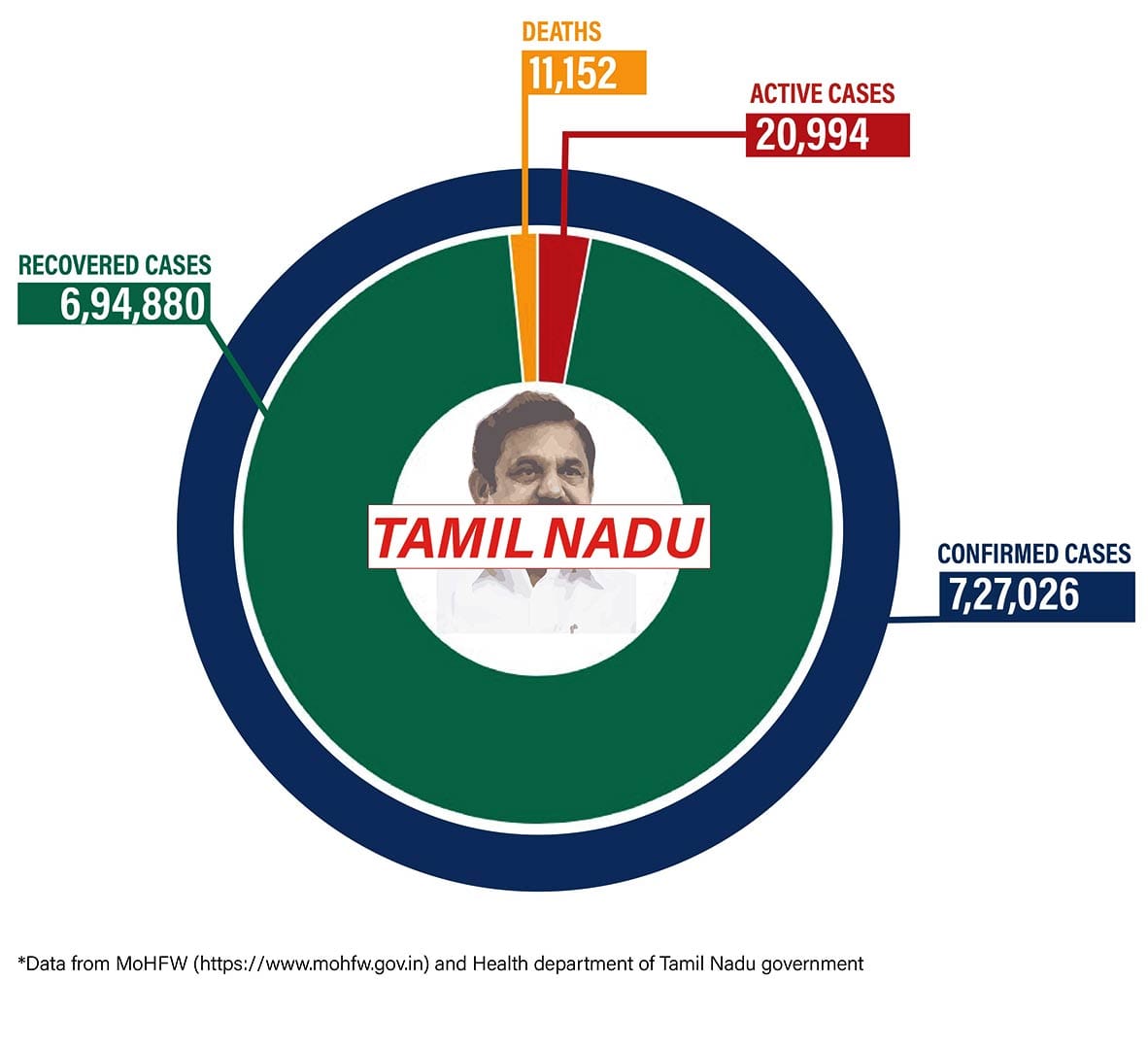 Tamil Nadu has reported 2,504 new cases in the last 24 hours, bringing the total number of cases in the state to 7,27,026. Of these, 20,994 are active cases. The state reported 30 deaths in the last 24 hours, bringing the death toll to 11,152.