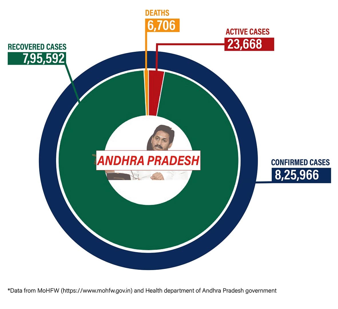 In Andhra Pradesh, 8,25,966 cases have been detected since the beginning of the pandemic. Of these 6,706 people have died and 16 deaths were reported in the last 24 hours.