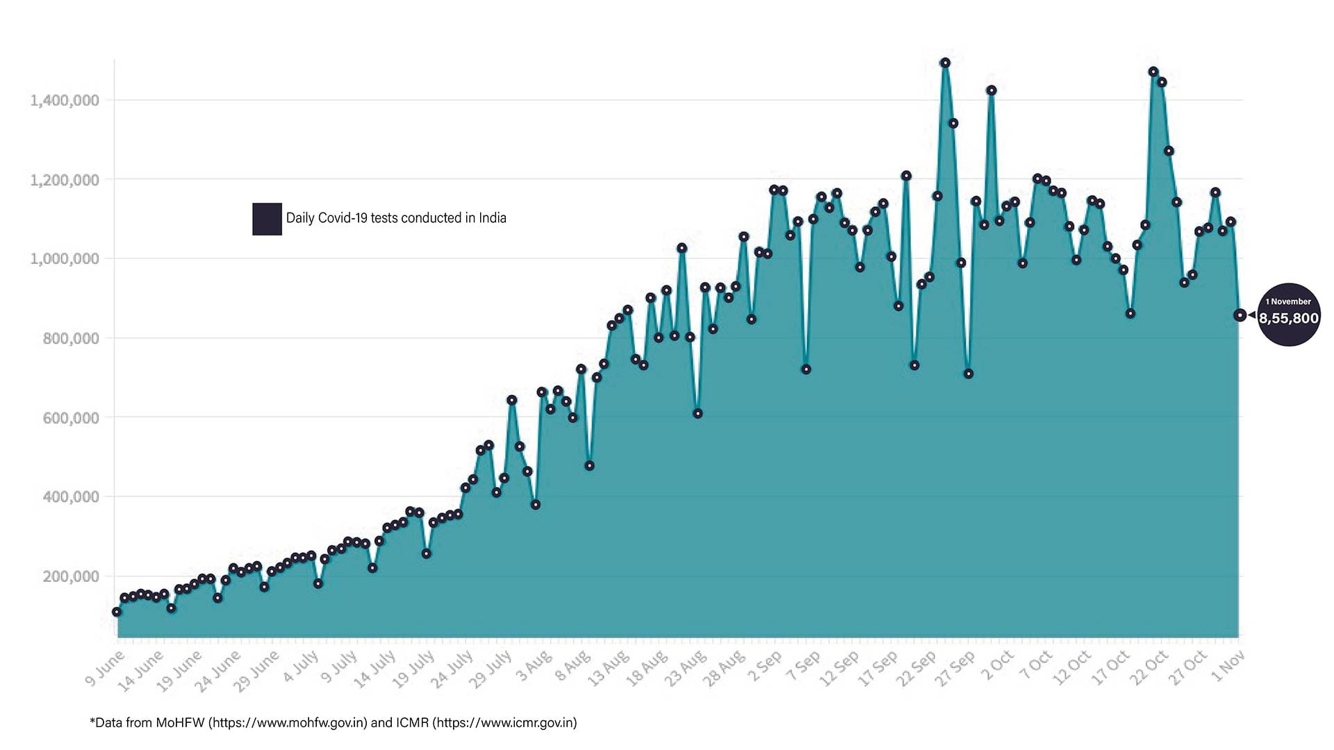 Every weekend, there is significant dip in testing numbers. This week as well, the number of tests conducted in the last 24 hours dropped sharply to just 8,55,800. A total of 11,07,43,103 tests have been conducted in the country since the beginning of the pandemic.