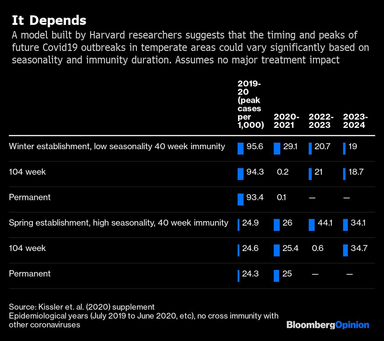 If it turns out that immunity is easily gained and long-lasting, infection rates should decline over time. If it’s transient and unreliable, the world could face annual or biennial outbreaks for years to come. One model of Covid-19’s future transmission dynamics suggests that the size of outbreaks will vary drastically depending on the virus’s seasonality and the duration of people’s immunity.