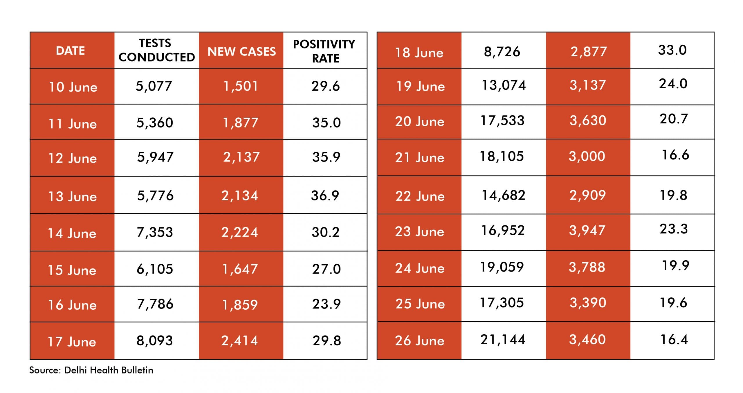 Delhi’s test positivity rate, the proportion of positive samples among the total number of tests conducted, has fallen from an average of 31 per cent (10-17 June) to an average of 22 per cent (18-25 June).