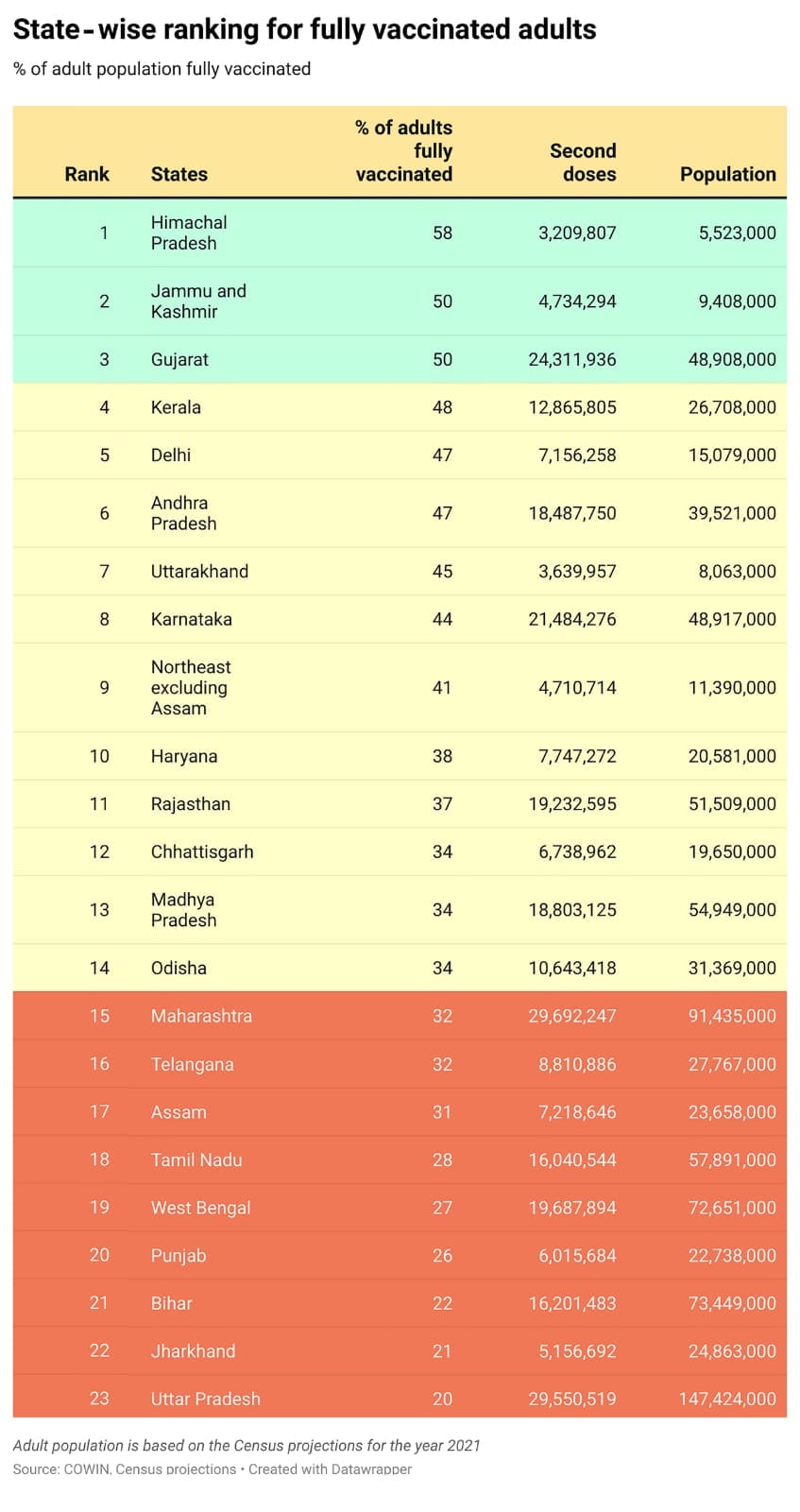 Jharkhand, Bihar, Punjab, West Bengal and Tamil Nadu are other states where not even a third of the estimated population has been fully vaccinated.
