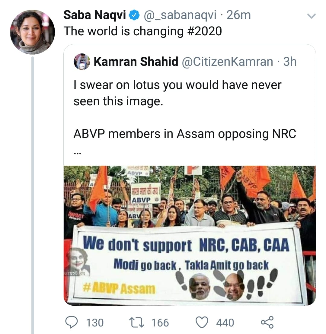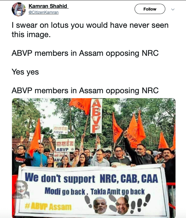 The image, however, has spread like a wildfire on both Twitter and Facebook with several users sharing this photograph claiming that the ABVP is also rejecting the NRC and the CAA.