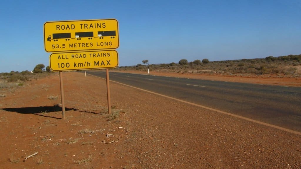 The actual image is from Western Australia and the signboard says ‘Road Trains 53.5 metres long’ All road trains 100 km/h MAX