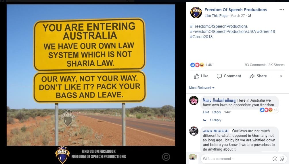 “The signboard says, “you are entering Australia, we have our own law system which is not Sharia law. Our way, not your way. Don’t like it? Then pack your bags and leave.”
