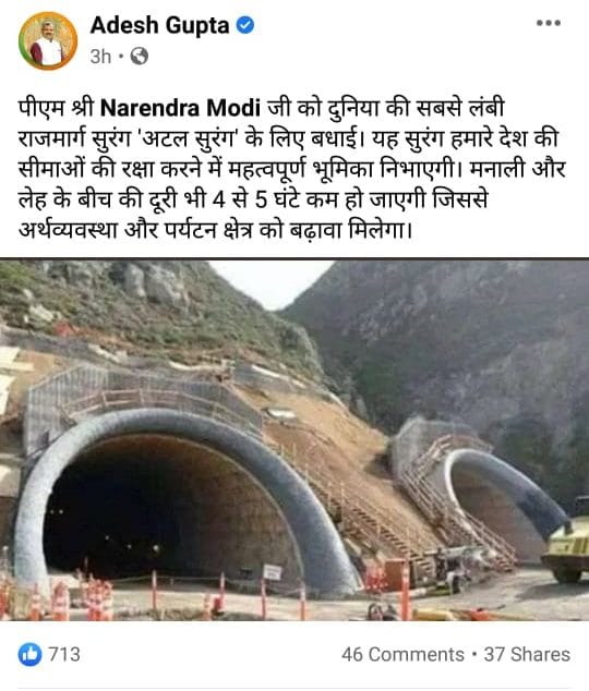 New Delhi: A photograph is being widely circulated by several politicians and media houses with the claim that it is the Atal Tunnel in Himachal Pradesh that was inaugurated by Prime Minister Narendra Modi Friday.