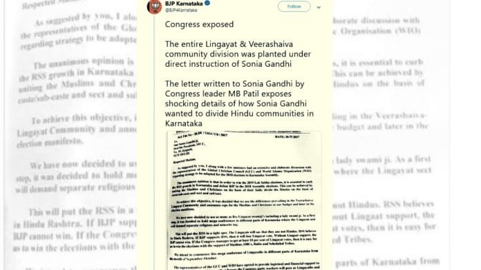 “The letter written to Sonia Gandhi by Congress leader MB Patil exposes shocking details of how Sonia Gandhi wanted to divide Hindu communities in Karnataka,” it further tweeted.