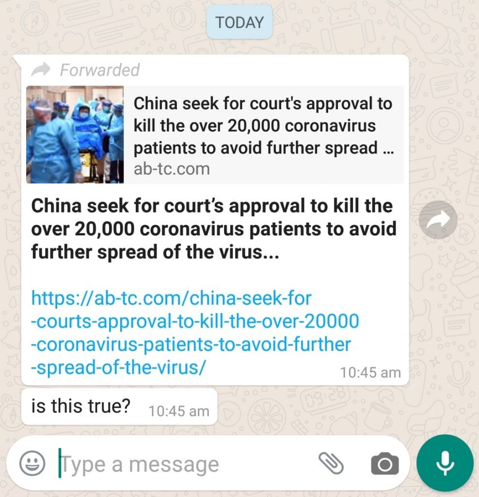The article that spells China as “Chhina” in the first sentence says: “The highest level of court in Chhina, Supreme People’s Court, is expected to give approval Friday for the mass killing of coronavirus patients in China as sure means of controlling the spread of the deadly virus.”