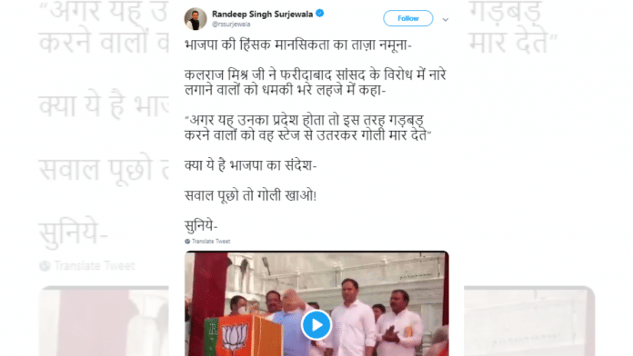 New Delhi: Congress MLA Randeep Surjewala posted a video on Twitter and wrongly quoted BJP leader Kalraj Mishra to take a jibe at the saffron party’s “violent mentality”.