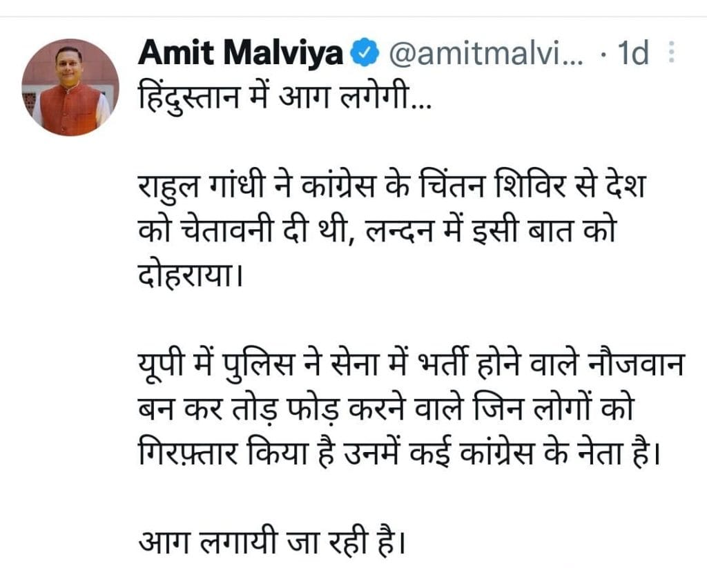 Amit Malviya, the in-charge of BJP’s National Information & Technology Department, tweeted along similar lines, “Some of those arrested in UP for protesting against the Agnipath scheme, are Congress workers. They are trying to set the country on fire.”