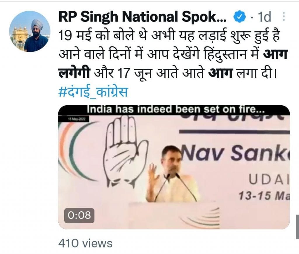 BJP’s national spokesperson R.P. Singh posted the same clip, saying, “On May 19, Rahul Gandhi said that a fight is about to commence and the country will be set on fire and from June 17, they have indeed started the fire.”