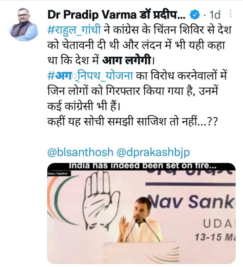 The clip has been uploaded by Dr Pradip Verma, the General Secretary of the Jharkhand BJP. His tweet says, “On the Congress’s Chintan Shivir event, Rahul Gandhi warned the country of how it would be set on fire. Out of those who have been arrested for opposing the Agnipath scheme, many are Congress workers”.
