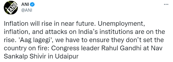 Rahul Gandhi spoke about rising inflation. That, “along with unemployment and attacks on various Indian institutions”, would set the country on fire, he said.