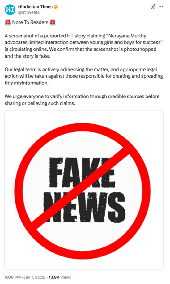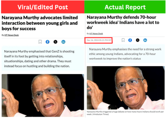 An X (formerly Twitter) user shared on 7 January a screenshot of a purported article by Hindustan Times, which stated that Murthy advocated for limited interaction between young boys and girls for their success.