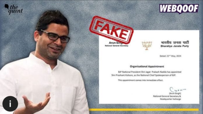 A fake letter is going viral to claim that BJP President Nadda is appointing Prashant Kishor as BJP’s National Chief Spokesperson.