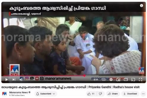 Various news channels broadcast live footage of Priyanka Gandhi visiting Radha’s house. A Manorama News video on YouTube shows a similar scene to the one in the original Asianet News card.
