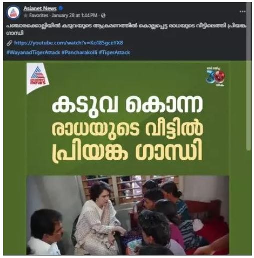 Amid this, a purported Asianet News card titled “Priyanka Gandhi at the House of Radha, Woman Killed in a Tiger Attack” has been widely shared on social media. The card features an image of Gandhi standing with her daughter, Miraya Vadra, with a caption alleging that Priyanka was smiling during her visit to Radha’s house.