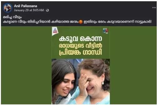 The original news card regarding Priyanka’s visit, shared by the official Facebook page of Asianet News, features Priyanka Gandhi alongside K. C. Venugopal, AICC General Secretary and MP for Alappuzha. The image in this news card shows both Congress leaders visiting Radha’s house and meeting her family.