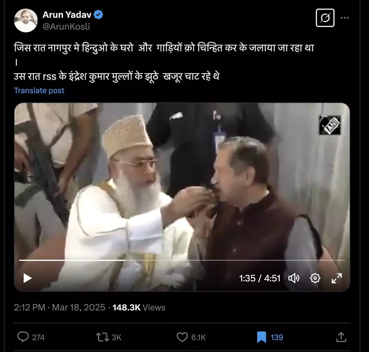 The video is being shared on X with a caption in Hindi that translates to, “The night when Hindu houses and vehicles were being identified and burnt in Nagpur. That night RSS’s Indresh Kumar was eating dates with the mullahs.”