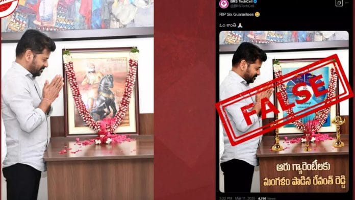 Hyderabad: A photo is circulating widely on social media claiming that Telangana Chief Minister A. Revanth Reddy paid tributes to a framed image of the ‘Six Guarantees’ announced by the Congress party during its poll campaign in 2023.