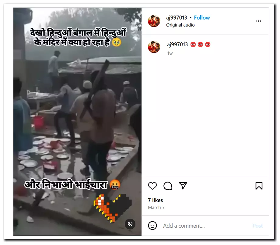 The video has been shared with an overlaid Hindi text that translates to, “Look, Hindus, see what is happening in Hindu temples in Bengal. So much for brotherhood”