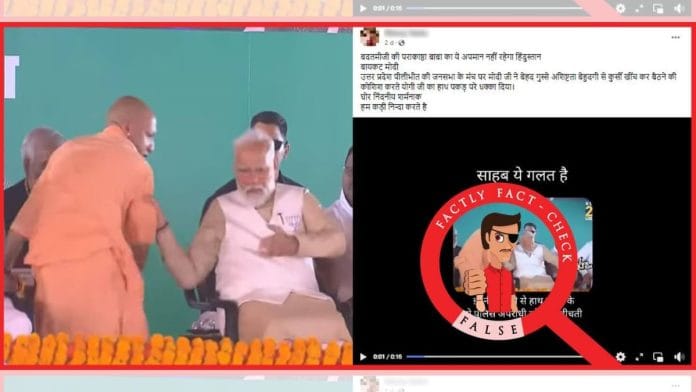 A video showing Prime Minister Narendra Modi pulling Uttar Pradesh Chief Minister Yogi Adityanath by the hand is being widely shared with the claim that Modi insulted Yogi by pushing him away when he attempted to bring up a chair to sit (here, here & here). The alleged incident took place during a public meeting in Pilibhit, Uttar Pradesh. This article verifies the claim made in the post.