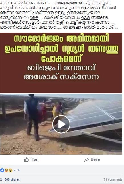 New Delhi: A Facebook post shared on the Aam Aadmi Party (AAP) Facebook group alleges that a BJP member of Parliament, Ashok Saxena, has said that using solar energy angers the sun god—which is why BJP supporters are now destroying solar panels.