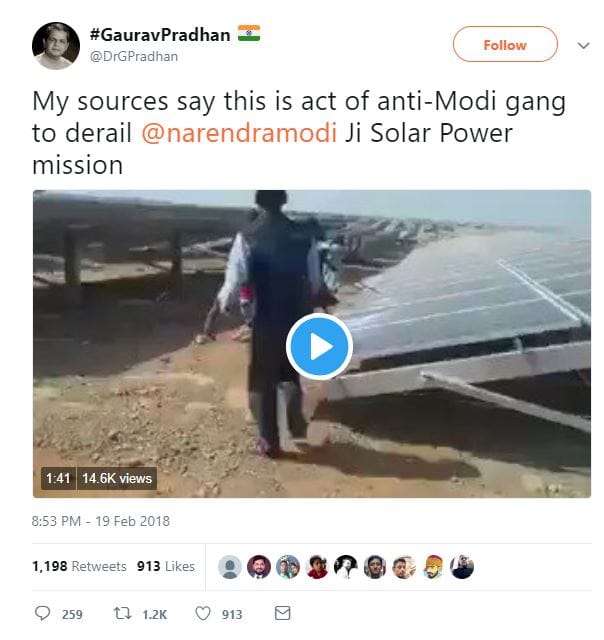 Incidentally, the same video went viral in February. On that occasion it had been shared by a BJP supporter, Gaurav Pradhan. He claimed that destroying the panels was an “act of anti-Modi gang”, the intention of which was to “derail” the “solar power mission” of the government.