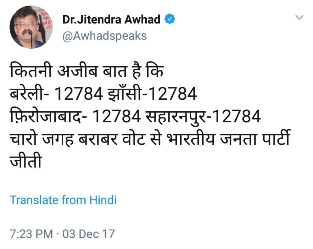 On Sunday evening, Dr Jitendra Awhad, a member of the Nationalist Congress Party, tweeted from his verified account that the BJP had won the civic polls in Bareilly, Jhansi, Firozabad, and Saharanpur by identical margins of 12,784 votes.