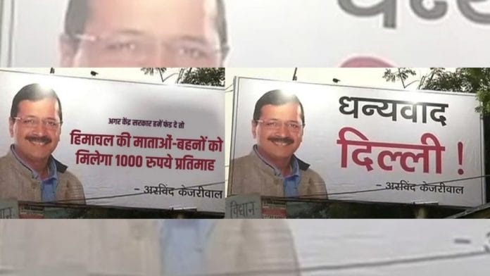 New Delhi: A billboard image showing Aam Aadmi Party chief and Delhi Chief Minister Arvind Kejriwal promising a monthly payment of Rs 1,000 to ‘mothers and daughters’ of Himachal Pradesh has gone viral on social media.