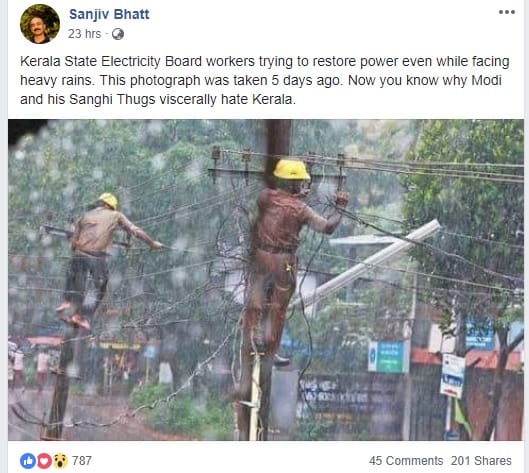 New Delhi: A picture of Kerala State Electricity Board (KSEB) workers trying to restore power in the flood-affected state was shared late Tuesday claiming to be five days old.