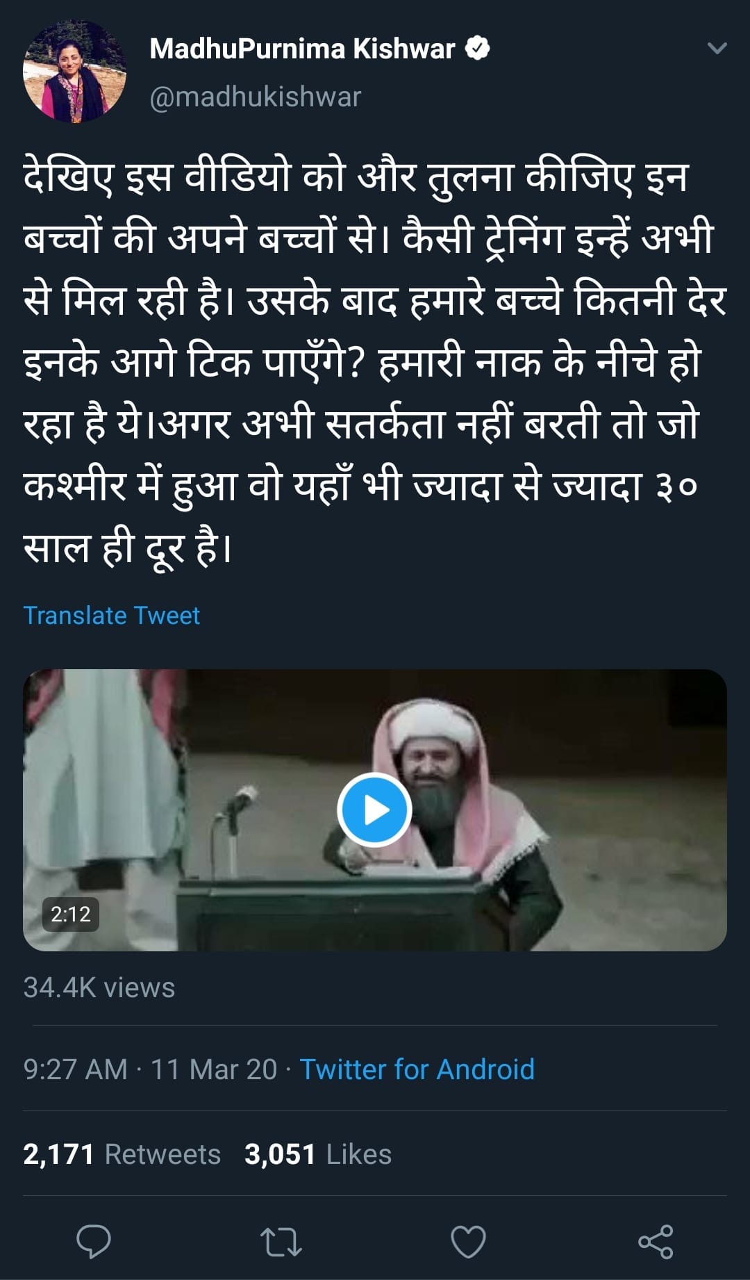 “Look at this video and compare these children to your own kids. Look at the kind of training that these young boys are receiving. After such training, how long will our kids be able to survive? All this is happening right under our nose. If we are not vigilant now, then whatever happened in Kashmir is bound to happen here in less than 30 years,” Kishwar wrote in her post.