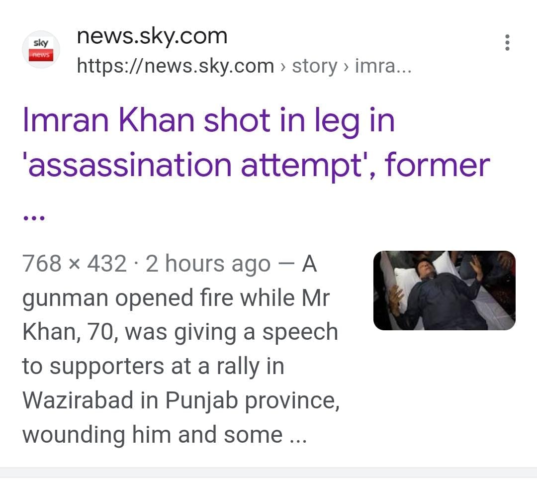 BREAKING: Former Pakistan prime minister Imran Khan shot in assassination attempt. Reports he was hit several times in his legs but survived & now being treated in hospital. Shooter was wrestled by another man as he fired, which may have saved Khan’s life. pic.twitter.com/rJbOhju01h