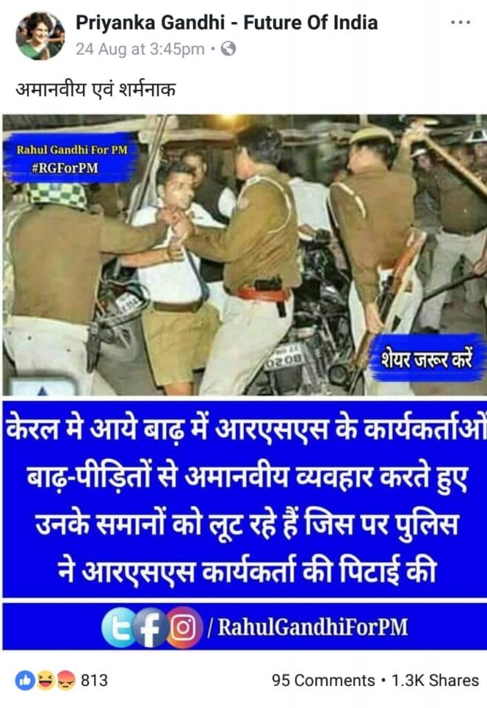 A Facebook page named Priyanka Gandhi – Future of India shared the image. The text on the image said, “The police is beating the RSS workers who were stealing the belonging of the Kerala flood victims.”
