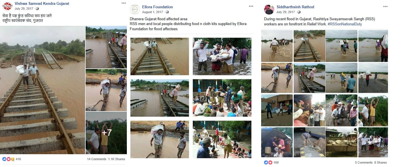 However, the pictures, although of RSS workers, are not from Kerala. A report said the pictures of RSS workers helping out the victims are from August last year during the Gujarat floods.