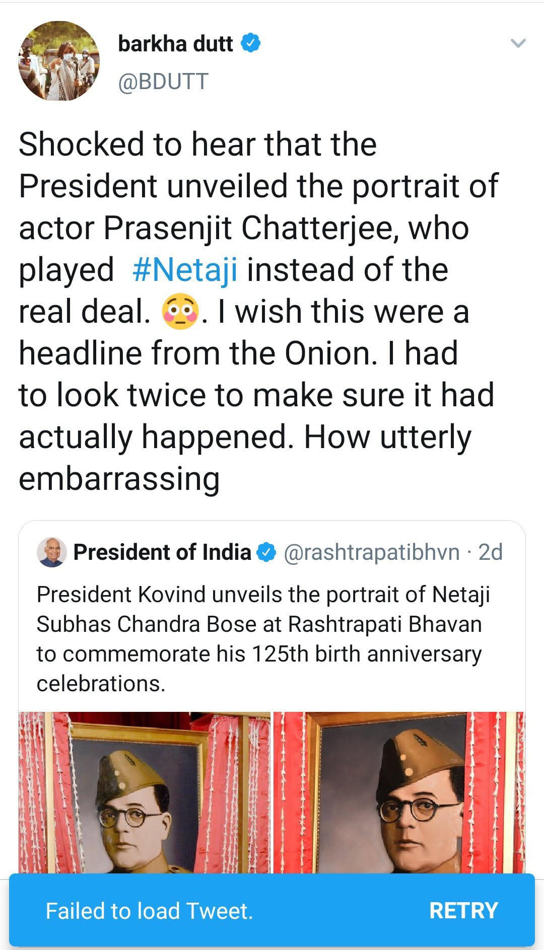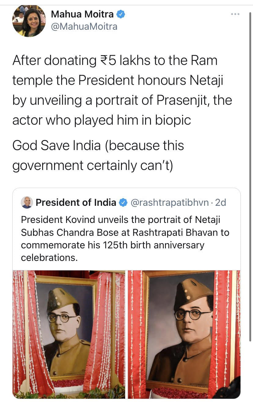 New Delhi: Trinamool Congress MP Mahua Moitra and journalists Rajdeep Sardesai and Barkha Dutt were among several Twitter users who fell for a hoax Monday surrounding the unveiling of a portrait of freedom fighter Netaji Subhas Chandra Bose at the Rashtrapati Bhavan.