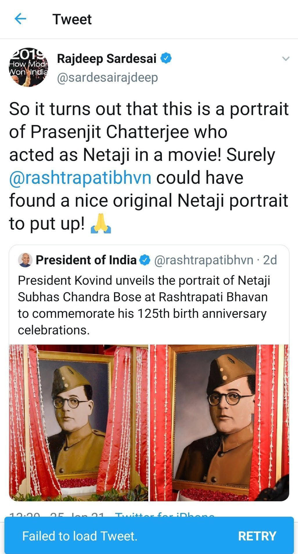 Soon afterwards, many Twitter users alleged that the portrait was not of Bose, but that of Bengali actor Prosenjit Chatterjee dressed as the freedom fighter for the 2019 film Gumnaami.